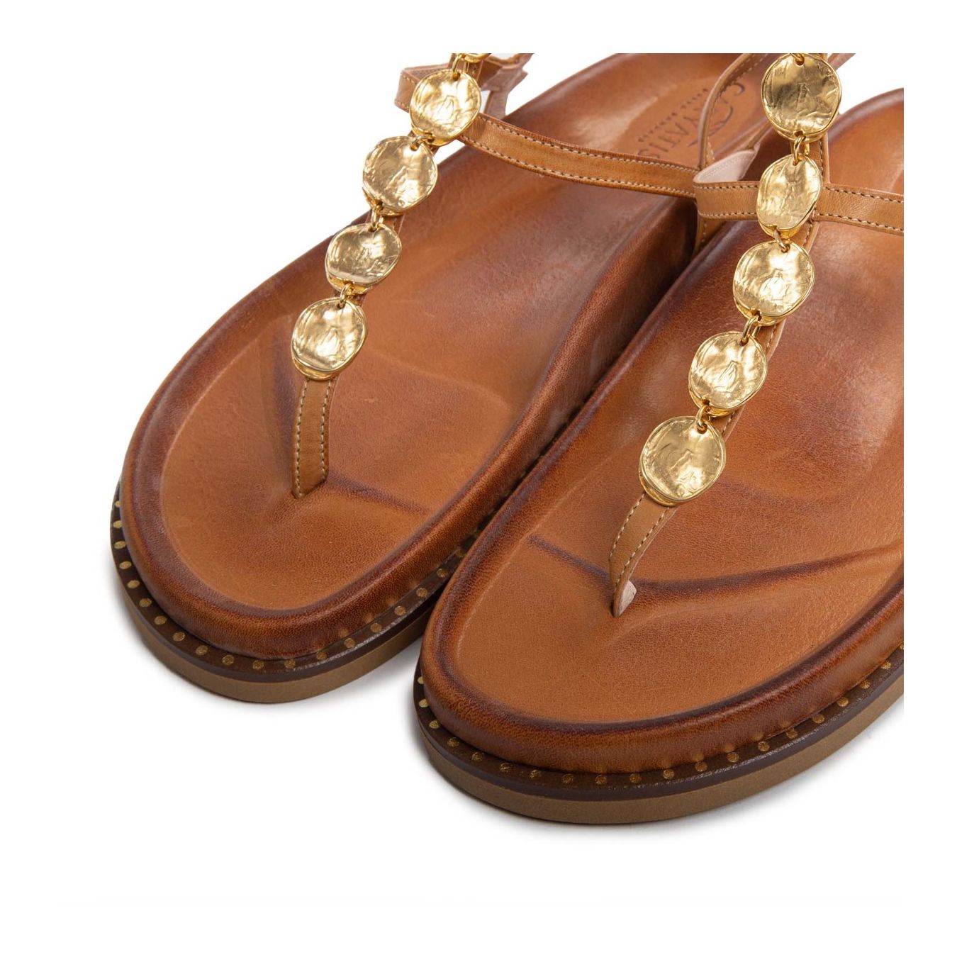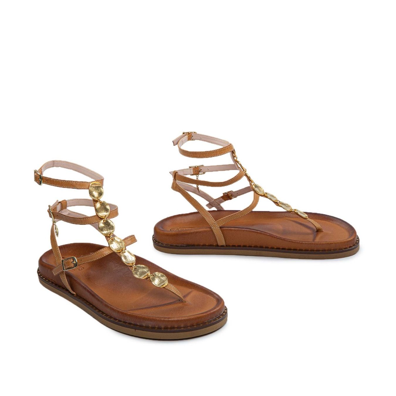 Elegante e versatile, il sandalo schiava di Caryatis è realizzato in pregiata pelle cuoio, morbida e resistente. Il design minimalista con cinturini sottili avvolge il piede garantendo comfort e stabilità, mentre la suola leggermente rialzata offre praticità per tutto il giorno. Perfetto per outfit estivi o look da sera raffinati, unisce stile senza tempo e funzionalità.