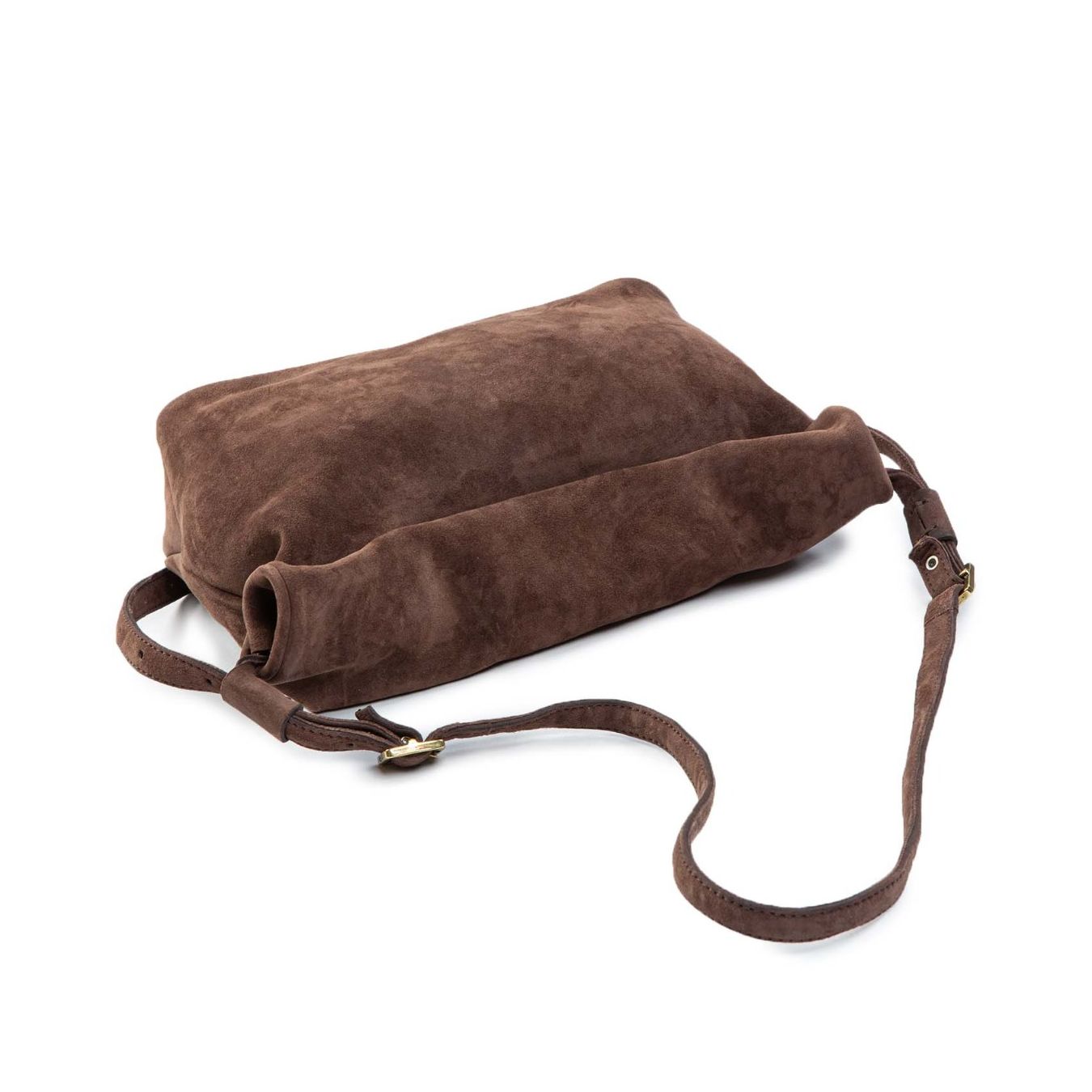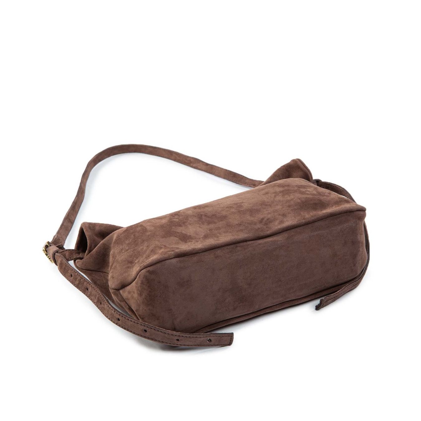 Scopri i dettagli tecnici della tracolla arrotolata in camoscio ebano: